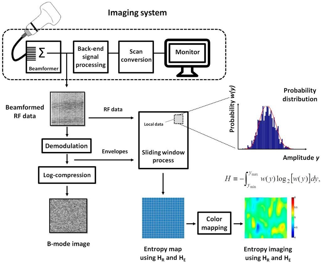 Algorithmic scheme designed for constructing the B-mode and information entropy images by using the backscattered signals. The B-mode image was formed using a logarithm-compressed envelope image. The image RF and uncompressed envelope data were used for entropy estimation (HR and HE) and imaging by using a standard sliding window algorithm.