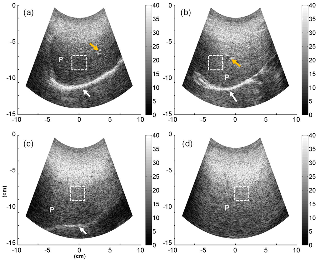 Grayscale B-mode images obtained from the participants with (a) normal; (b) mild; (c) moderate; and (d) severe fatty livers. The square windows with white dotted lines represent ROIs. The text “P” means the liver parenchyma. The white and orange arrows indicate the diaphragm and vessels (portal vein), respectively.