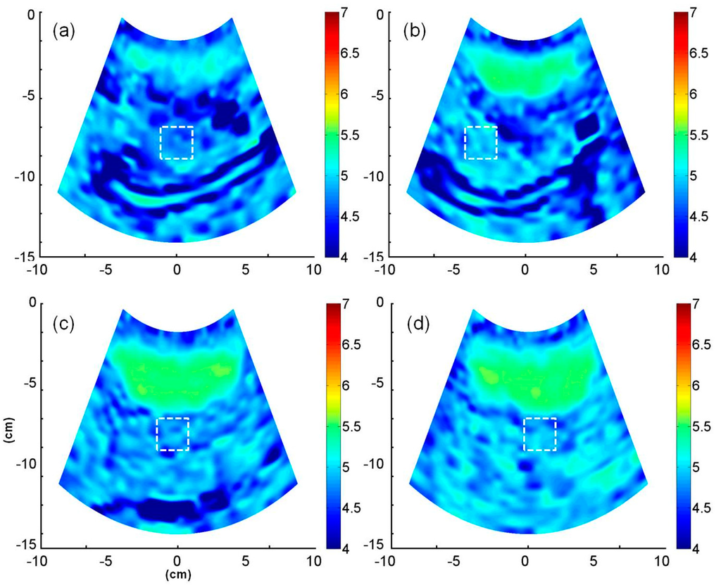 Entropy images (based on HR, constructed using the RF data) corresponding to (a) normal; (b) mild; (c) moderate; and (d) severe fatty livers. The square windows with white dotted lines represent ROIs.