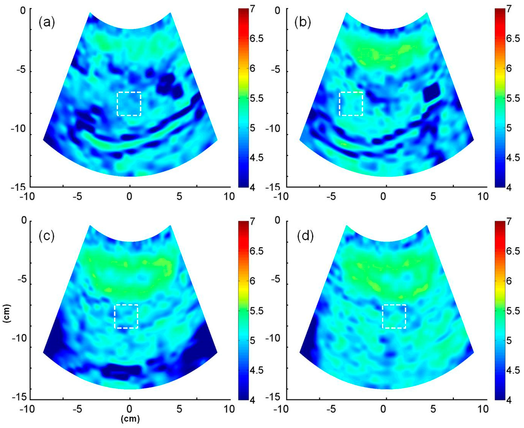 Entropy images (based on HE, constructed using the uncompressed envelope data) corresponding to (a) normal; (b) mild; (c) moderate; and (d) severe fatty livers. The square windows with white dotted lines represent ROIs.