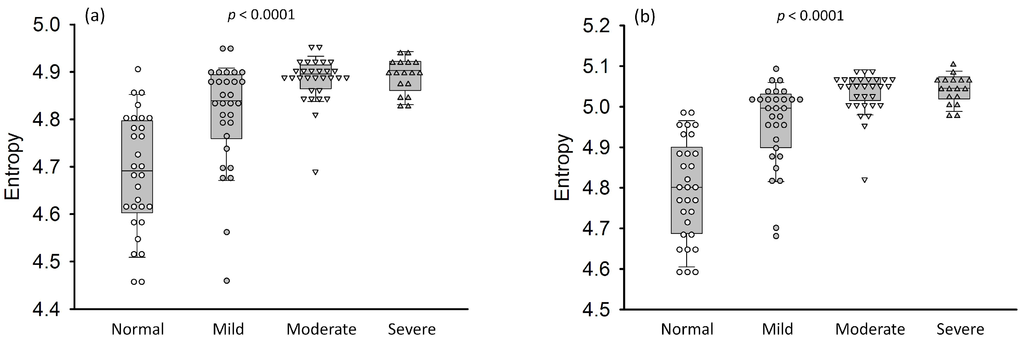 In the previous study [28], some basic criteria were suggested to select the region of interest (ROI) for liver image analysis: (i) using a relatively small ROI to locate on the liver parenchyma. A small ROI easily excludes blood vessels (e.g., portal venous branches or hepatic veins) to reduce the bias of analyzing liver parenchyma; (ii) the location of the ROI should be at the focal zone, reducing the effects of attenuation and diffraction on the image analysis; (iii) selecting one ROI in individual images obtained from multiple scans of liver for averaging the results. According to the above suggestions, a ROI with a size of 2 × 2 cm2 located at the focal depth in the B-mode image was manually selected by the other radiologist (blinded to the diagnosis of fatty liver) and applied to the corresponding entropy image to collect pixel values (17,746 samples) for averaging. Entropy values estimated using the RF and uncompressed envelope data (HR and HE) as a function of sonographic fatty stage was expressed as the median and the interquartile range (IQR). The Pearson correlation coefficient r and the probability value p were calculated for evaluating the correlation between the entropy and the fatty stage (p < 0.05 means a significant correlation). Then, the normality test was performed to examine whether the entropy values obtained from normal and fatty stages follow the normal distribution (p > 0.05 means a normal distribution). Receiver operating characteristic (ROC) curve analysis with 95% confidence intervals (CIs) was performed to obtain the area under the ROC curve (AUC). The predictive entropy values for diagnosing (i) normal versus fatty livers (≥mild); (ii) normal—mild stages versus moderate—severe stages (≥moderate), and normal—moderate stages versus severe stages (≥severe) were determined by the closest point to (0, 1) on the ROC curve. Under this condition, sensitivity, specificity, and accuracy were reported. All statistical analyses were performed using SigmaPlot software (Version 12.0, Systat Software, Inc., Chicago, IL, USA).