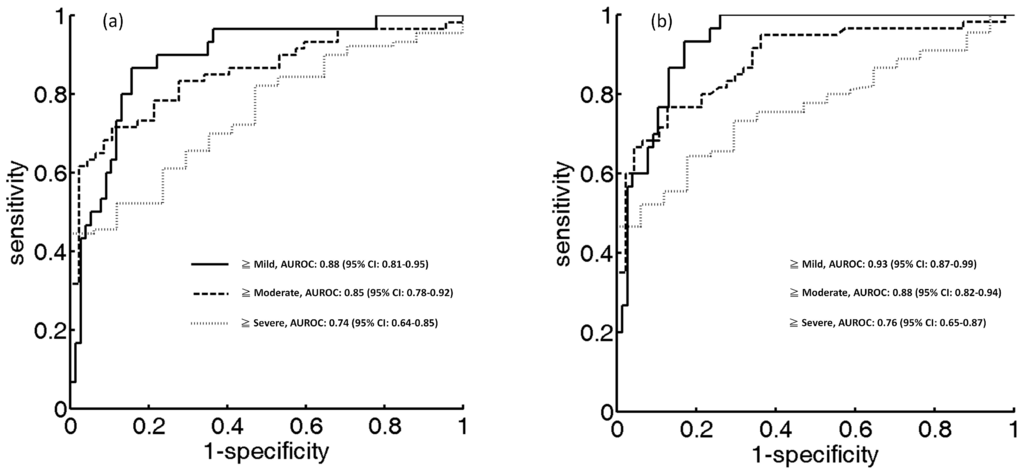 ROC curves for diagnosing different fatty liver stages using entropy imaging based on (a) HR and (b) HE. The AUCs obtained using HR (95% CIs) were 0.88 (0.81–0.95), 0.85 (0.78–0.92), and 0.74 (0.64–0.85) for fatty stages ≥mild, ≥moderate, and ≥severe, respectively. The AUCs of HE (95% CIs) were 0.93 (0.87–0.99), 0.88 (0.82–0.94), and 0.76 (0.65–0.87) for fatty stages ≥mild, ≥moderate, and ≥severe, respectively. Compared with HR, using HE for ultrasound entropy imaging provided an improved performance in detecting fatty liver.