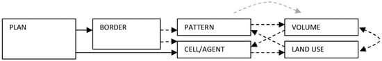 Figure 1 presents the conceptual framework of the model. The system of interacting urban actors (“agents”, integrated into cells) is represented as variables and their relations. The structure of the model follows this schema. The main dynamics in the case area result from four types of temporal interactions between six types of variables. The variables are a cell (agent) (independent variable (iv)), pattern (dependent variable (dv)), land use (dv), volume (dv), border (intermediate variable) and plan (iv) (Table 5). The directions of interactions in this approach are top-down (plan, border), bottom-up (from agent by land use/volume to pattern), feedback (from pattern to agent), uniform level (between agents). Following the principles of agglomeration economics and empiria, the actors seek favorable locations in the proximity of similar actors in the area. A static border resulting from the plan surrounds the area.
