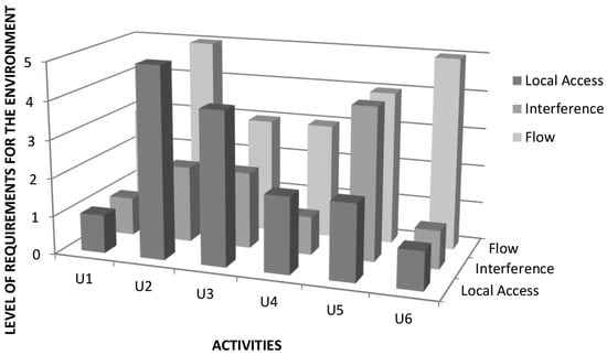 Degree of interaction between activities and their environment for classification of activities: U1, housing; U2, retail; U3, services; U4, offices; U5, light industry; and U6, warehouses. Local Access refers to the local interaction between the site and its environment—how easy it is to access the site, for example, from the street. Interference refers to the level of “disturbance” it tolerates—for example, regarding noise or air quality; and Flow to moving of goods and people to/from the site, implying global accessibility by car, truck etc. The classifications were made on the basis of these assumed relationships. (For example, the requirements for housing regarding disturbance (environmental “interference”) due to noise, smells or heavy traffic differ from those for retail or warehouses. Similarly, some activities need easy access from the street with less privacy, while others benefit from being part of the higher-scale networks, providing constant flows of customers, goods, or material).