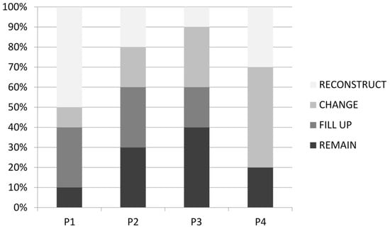 Modes of cell transformation according to their utilization rates. P-1: “empty”, FAR = 0–0.1; P-2: “nearly-empty”, FAR = 0.1–0.3; P-3: “nearly-full”, FAR = 0.3–0.7; P-4: “full”, FAR = 0.7–1. For example, an almost empty cell is likely to be filled more, but also to be reconstructed—at presumably fairly low demolition costs of smaller buildings, whereas nearly full sites might be considered the most resistant to physical changes, but the new additions or uses may occupy these sites easily (see also Table 6).