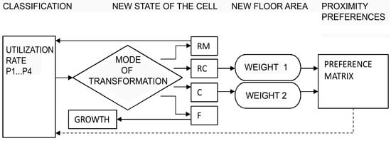 Each cell was unique as regards form, number and type of neighbors, and quantity and quality of activities. The floor area ratio followed the current plan, varying between 0.5 and 1.25. Cells were classified into four categories according to the utilization rate reflecting the share of utilized building right (see Equation (1)), namely empty, nearly-empty, nearly-full and full (Figure 4). The quantitative cell state affected the site’s future mode of transformation following the probabilities presented in the Figure 4 for each case. The utilization rate varied at each iteration.