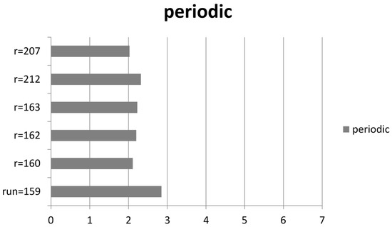 where is the relative share of the entities; t is the number of a certain regeneration cycle; and tall is the number of different cycles in that run. The resulting entropy values are presented in Table 10. This equation describes the overall entropy of the simulation after the runs are completed, providing an estimated level of complexity in regards of time steps between changes in utilization of building right. (For example, for a periodic run 160, the cycle of 10 occurred 72 times out of a total of 178 different cycles. Hence, for run 160, = 72:178 = 0.040449 and consequently, = −1.3058. Thus = 0.5282. This calculation was carried out for each cycle (10, 11, 12, 16, 22, etc.) for the total sum, yielding the entropy value of run 160).