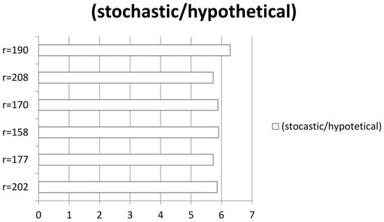 Since no chaotic state was perceived in this study, a stochastic set was created for purposes of comparison, indicating the maximum value of entropy in the system. For this set the entropy was calculated in a hypothetical case using the data set resulting in complexity and calculating its entropy assuming all values to be unique, occurring only once. As expected, the degree of entropy for these stochastic comparison groups was high, all of them above 5.70 (Figure 8).