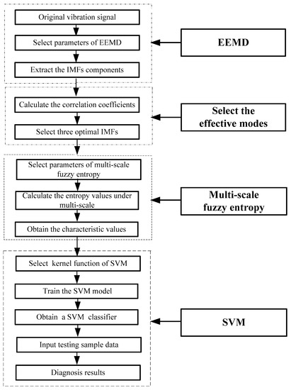 The key to fault diagnosis is choosing the appropriate method to identify the type, quantity, location, and severity of fault based on the fault mechanism [48,49]. Extracting mechanical fault feature information from the fault vibration signal using a suitable signal analysis method is one of the most important steps. The EEMD method is an improved EMD method, which can effectively avoid mode mixing in the process of EMD decomposition by adding Gaussian white noise. It uses the statistical properties of Gaussian white noise to decompose the vibration signal in order to obtain an uniform distribution of frequency. Multi-scale fuzzy entropy based on multi-scale analysis and fuzzy entropy can effectively obtain multiple scale time series from the original time series and calculate the fuzzy entropy value of each coarse-grained time series. The SVM based on structural risk minimization is one of the most popular tools. It can map the original nonlinear data into a higher-dimensional feature space. Thus, in order to effectively extract fault feature information and diagnose the faults from the vibration signal, the advantages of each method are fully utilized, and a new fault diagnosis (EOMSMFD) method based on combining EEMD, model selection, multi-scale fuzzy entropy and SVM is proposed to realize fault diagnosis. In the proposed EOMSMFD method, fault vibration signals of the inner ring, the outer ring, and the rolling element of the motor bearing are decomposed into a series of IMFs and residual components by using the EEMD method with appropriate parameters. Then, the correlation coefficient between each component and original signal are calculated in the frequency domain. The value of the correlation coefficient is between 0 and 1. The component correlation with a larger value shows that the component is more related to the original signal. Three components with larger value of correlation coefficient are selected here. Next, the parameters of multi-scale fuzzy entropy are selected according to the characteristics of signal, and the values of multi-scale fuzzy entropy of three selected components are calculated to form a feature vector with the complexity measure. The obtained entropy values are selected as characteristic vectors to train the SVM model and construct a SVM classifier for fulfilling fault pattern recognition. The flow of the proposed EOMSMFD method is shown in Figure 1.