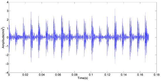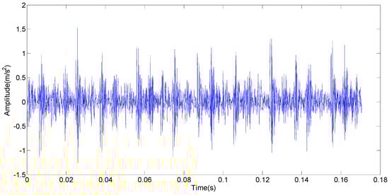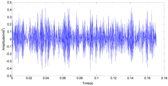 The motor bearing with no-load and a fault diameter of 0.007 in. is selected here, which is used to show the time-domain waveform of the fault vibration signal. The time-domain waveforms of the original vibration signals are shown in Figure 2, Figure 3 and Figure 4. Figure 2 is the time-domain waveform of the fault vibration signal of the inner race. Figure 3 is the time-domain waveform of the fault vibration signal of the outer race. Figure 4 is the time-domain waveform of the fault vibration signal of the rolling element.