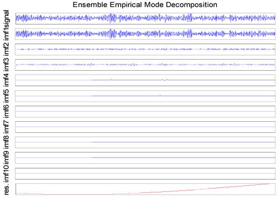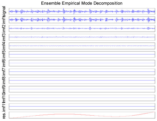 - Step 5: The average of the corresponding is calculated for the M-th decomposition. The calculation result is obtained:where is the j-th IMF decomposed by EEMD when and .
