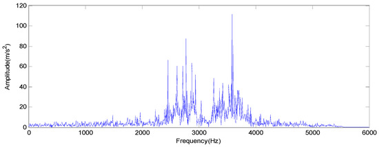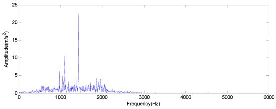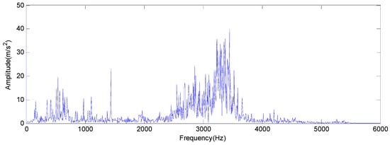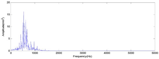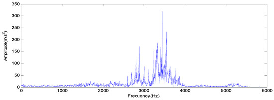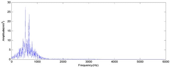 The spectrums of original vibration signals and selected three major modes are shown in Figure 8, Figure 9, Figure 10, Figure 11, Figure 12, Figure 13, Figure 14, Figure 15, Figure 16, Figure 17, Figure 18 and Figure 19. Figure 8, Figure 9, Figure 10 and Figure 11 are the spectrums of the fault vibration signal of the inner race. Figure 12, Figure 13, Figure 14 and Figure 15 are the spectrums of the fault vibration signal of the outer race. Figure 16, Figure 17, Figure 18 and Figure 19 are the spectrums of the fault vibration signal of the rolling element.
