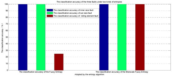 As can be seen from Table 5 and Figure 20, for the fault vibration signal of the inner race and the outer race, it can be seen that the proposed EDOFSFD method and the EOMSMFD method can both obtain a diagnosis accuracy of 100%. However, for the fault vibration signal of the rolling element, it can be seen that the test accuracy of the proposed EOMSMFD method and the EDOFSFD method is 100% and 25% in the experiments, respectively. Thus, the proposed EOMSMFD method has a higher diagnosis accuracy than the EDOFSFD method. For the EDOFSFD method and the EOMSMFD method, the EEMD, mode selection, and SVM are the same. Multi-scale fuzzy entropy is used to extract the feature from the vibration signal in the proposed EOMSMFD method, and fuzzy entropy is used to extract the feature from the vibration signal in the proposed EDOFSFD method. This shows that the multi-scale fuzzy entropy can better extract features from the vibration signal than can fuzzy entropy. Thus, the feature extraction and fault diagnosis capabilities of the proposed EOMSMFD method outperform the EDOFSFD method. The EOMSMFD method is the most effective method for extracting the fault feature from the collected vibration signal and for diagnosing the faults.