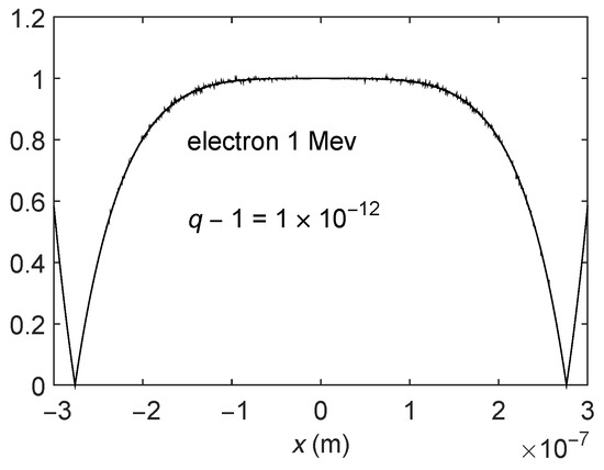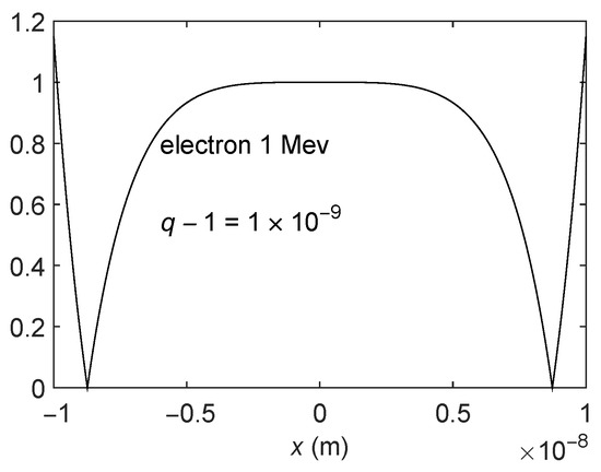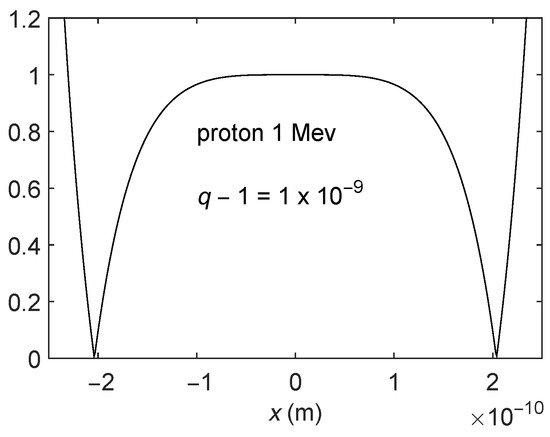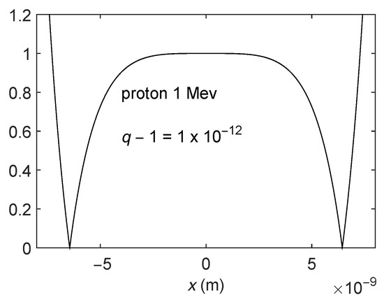 In this subsection, we intend to make comparisons between the approximate and exact solutions of q-Schrödinger equation. To this end, we first try to evaluate the modulus of the ratio R of the functions (13) and (18). As an example, we display R in four figures corresponding to an electron and a proton with 1 MeV of energy at (Figure 1, Figure 2, Figure 3 and Figure 4). Note that, for a range of x very large in terms of atomic or nuclear relevant distances, the ratio R is essentially unity. Our approximation can then be deemed very good for the x-ranges shown in the figures, where R is close to one.