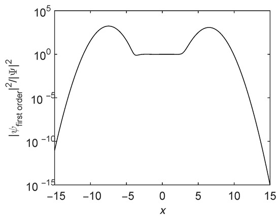 By construction, , as given by Equation (35), is a first order solution to Equation (11). Figure 5 displays the ratio between Equation (11) and (35) versus distance x (in absolute units) for . Note that the ratio is essentially unity for distances very much larger than atomic or nuclear ones. Thus, the approximation can be considered quite good.