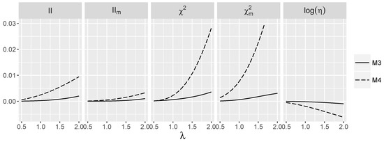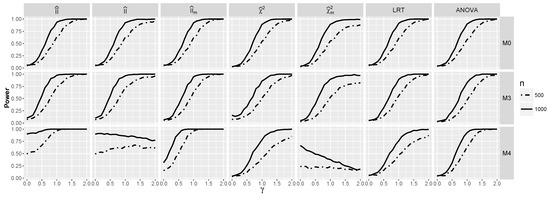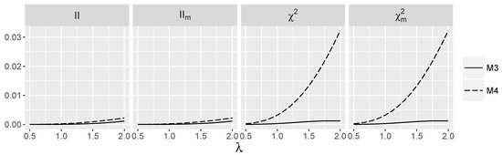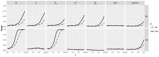 Now, we focus on models and . From Figure 1, we see that for , index is very close to zero, and predictably, the power is close to the significance level for such λ (see Figure 7). However, for larger λ, the power of and increases for , and in the case of , this holds also for . The difference between the behavior of on the one side and and approximations on the other for model is remarkable and shows that modification incorporating is worthwhile. However, for model , it does not improve the performance of . Note also that unsurprisingly. The power of the test stays close to the significance level, but the power of ANOVA starts to increase for large λ. A clear winner in both cases is the test based on , which performs very well for both models, as it takes advantage of the good performance of for and for model .