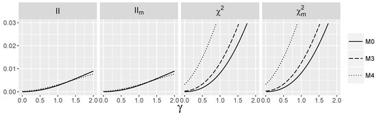 We consider now the power of the tests with respect to logistic interaction parameter γ for models and Note that is now included as is positive for . In all cases, performs better than , supporting the usefulness of the correction. works comparably to ANOVA and, in some cases, worse than and . We stress that this does not contradict the fact that is the most powerful test at the level α for null hypothesis . Indeed, it follows from the previous experiments that predictive interaction tests are not level α tests for ; thus, they may have larger power than . The power of and is around for , even for γ close to zero, when for , it stays around a significance level of 0.05. Note also that and fail to detect the predictive interaction for model .