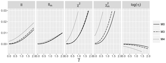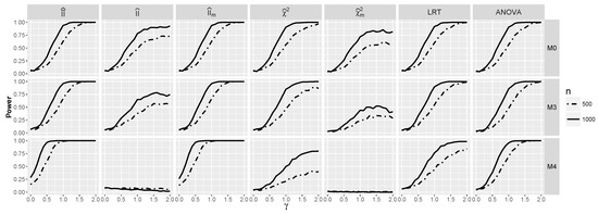 Obviously, when logistic interaction is present, the test performs much better (see Figure 9). The same applies to ANOVA and , but the best performance is again exhibited by . Consider, e.g., its performance for the model . Its excellent behavior for small γ’s stems from the very good performance of , whereas for larger γ’s from the performance of Comparing Figure 9 and Figure 10, we see that the dependence between predictors improved the performance of the tests based on the interaction information measures, especially for a smaller sample size, which is consistent with the larger values of the interaction information in the dependent than in the independent case. Note that in the dependent case, the power of and for is above for γ close to zero, whereas it is less then for such γ in the independent case.