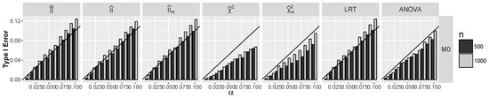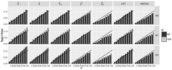 Note that for dependent and , only satisfies the null hypothesis, as for the models and , index is negative. It follows from Figure 6 that for all tests apart from tests, Type I error for is approximately α, and it is significantly smaller than α for both tests. For larger α and errors for information, interaction tests exceed slightly α, similarly to LRT.