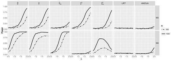 The behavior of the discussed tests is analogous to the case of independence (see Figure 8) with one important difference. Namely, now performs better than apart from model for and . and ANOVA do not detect any interaction for , but the power of ANOVA starts to pick up for large λ. Note the erratic behavior of the test for which the power actually starts to decrease for larger λ. This possibly is caused by the fact that the test is not well calibrated and the fact that is likely to become negative for large λ. The power of is the largest one among all tests.
