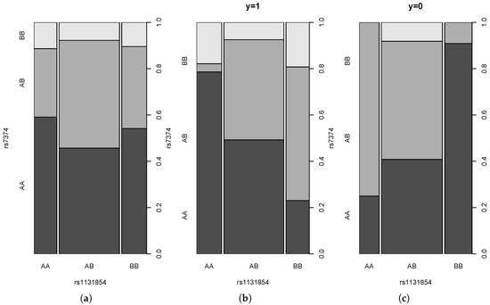 We perform the analysis of a real dataset in order to show that the pairs of SNPs that correspond to large values of interaction indices exhibit interesting patterns of conditional dependence. We used data on pancreatic cancer studied by [27] and downloaded from the address [28]. They consist of 208 observations (121 cases and 87 controls) with values of 901 SNPs. We applied tests , and for all pairs and with Bonferroni correction resulting in an individual level of significance , where . All three tests rejected the null hypothesis for 11 pairs. The pair of SNPs with the largest values of and is the pair (rs1131854,rs7374) with values and . Figure 11 shows the probability mass function of this pair (a) and of the conditional mass functions given (b) and (c).