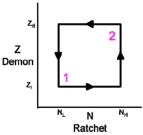 Figure 1 shows the general concept for a cycle that would create an exception to the second law. Z represents some potential or work function. It could be gravity, electric potential or some other function. N represents the number of particles in the system.