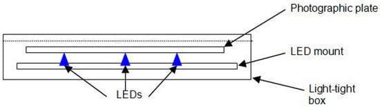 The apparatus is as shown in Figure 2. Several LEDs of various types were mounted on a printed circuit board, each with its contact leads shorted together. High speed (Fuji Superia 3200, Tokyo, Japan) color film was mounted in parallel to the board with LEDs. Working in a dark room, that assembly was put together in a light-tight plastic box (Hammond 1594EBK, Guelph, ON, Canada), which in turn was sealed with black tape. The assembly sat on a shelf for several months, after which the film was extracted (again in a dark room). The film was then taken to a commercial service for development.