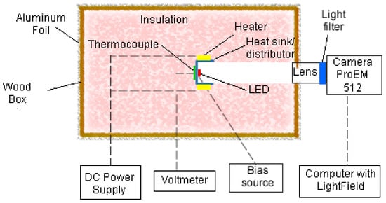 The camera is a ProEM 512® from Princeton Instruments (Trenton, NJ, USA). It uses their lowest pixel resolution to minimize the exposure time needed for each pixel. It has a relatively high quantum efficiency to capture near infrared from the LED. A light filter is mounted in the lens. A computer with Princeton Instrument’s LightSource® software Version 6.0 drives camera operation and captures image output. The LED is held against a heat sink/distributor (for good heat transfer) by a spring clip. Twisted conductors are run from the LED leads to a switchable bias source (open, shorted, +1.5 V, 1.5 V). The heat sink/distributor has heating resistors attached (2 × 20 Ω in parallel, 50 W), which are in turn driven at up to 90 watts from a variable DC power supply. Temperature at the heat sink/distributor is measured by a thermocouple. The heat sink/distributor, heater and LED assembly is housed in a fiberglass-filled wood box and covered with aluminum foil. The camera and box are mounted firmly together to maintain focal distance to the LED. Tests are run in a dark room.