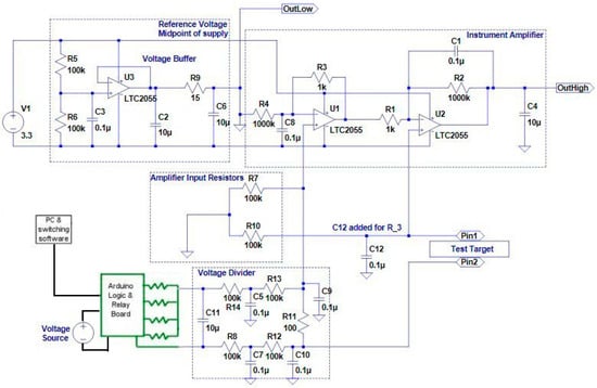 The complete circuit for driving the sweep voltage and detecting net voltage is shown in Figure 7. It is described in the Supplemental Materials, Test Results, and Section 5: Test Setups and Procedures.