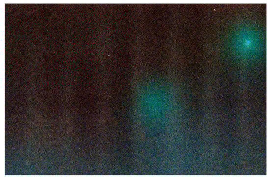 In our first experiment on LED emissions, a strip of film was exposed to a set of LEDs (each with its leads tied together) for a period of several months (see Section 2.1.1 in the Materials and Methods). When developed, the film showed frames like the one in Figure 9 (which contains the clearest effect we were looking for, while containing no obvious flaws). The glowing areas, one small and focused, one large and blurred, are arguably the result of photons emitted from two LEDs.