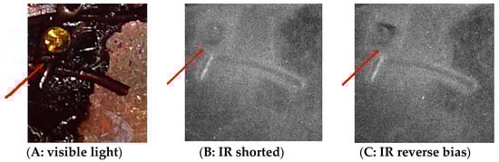 - Observe the image captured for open and closed connection to the LED leads and with reverse bias on the leads. Sufficient reverse bias will surely block electron leaps across the LED junction. If there are photons being generated at no bias, the image with reverse bias should be different from the other two.