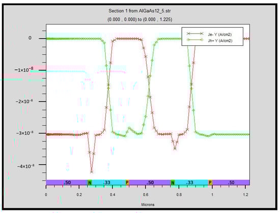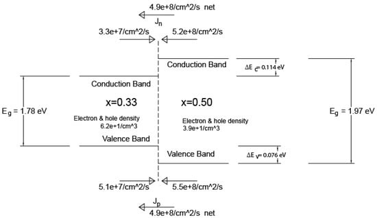 We can calculate the net flow of carriers from high carrier density to low carrier density materials that we used in ATEC prototypes, AlGaAs with 0.5 and 0.33 Al, respectively, based on Yang et al. [11]. The following equations from the paper for electron and hole motion are evaluated in Table 1.