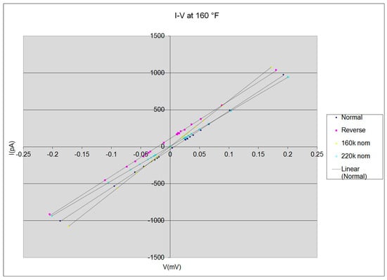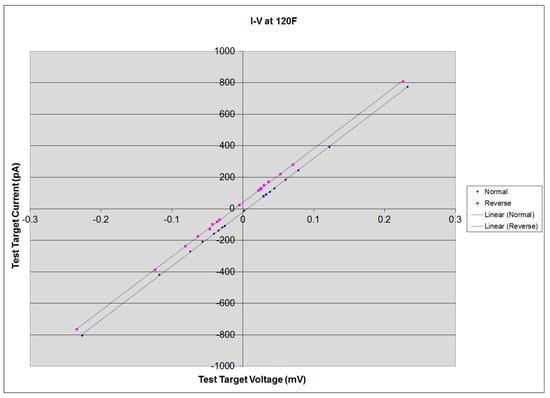To establish confidence and credibility for our test method, we collected data points either side of zero input: a sweep. The sweep order was programmed to run from a small positive voltage to maximum positive voltage and from small negative voltage down to maximum negative voltage. There was a 40-s delay from sweep voltage setting to voltage measurement mitigating the effects of system capacitance. The zero sweep voltage point output should fall on the straight line of outputs from the rest of the sweep. Interim data were recorded and inspected for stability. All sweep data are available at the ThermaWatts, LLC website [3].
