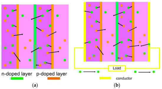 Churning with doped layers. (a) High and low density layers with n-doped and p-doped layers added; (b) Complete assembly of layers with contacts and load added.