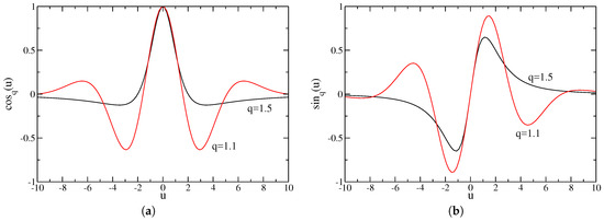 Plots of the real and complex parts of , i.e., (panel (a)) and (panel (b)), respectively, for two different values of (cf. Equations (25)–(28)). Due to the amplitude , the oscillatory behavior is strongly depressed for increasing values of q. All quantities exhibited are dimensionless (from [83]).