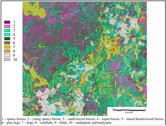 The most wide-spread ecosystems in CFBR (Figure 1) are old spruce forests with a mixture of broad-leaved or small-leaved trees (59% of the core reserve area in 1986 and 49% in 2010), birch or aspen stands and fellings (32% in 1986 and 30% in 2010), restoring spruce forests at windfalls and burnt areas (12% in 2010), and bogs (9% of the core reserve area in 1986 and 11% in 2010) [24]. Puzachenko et al. [24] reported that the bog area in the CFBR had increased by 20% in 1986–2010 due to the propagating of bogs toward surrounding forests and the destruction of swampy pine forests. This may be connected with a significant increase in winter temperature (by 4.0 °C in January) and annual precipitation in 1963–1999 [38], resulting in an increase of duration of mid-seasons.