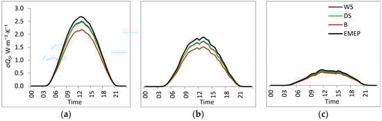 Diurnal course of entropy production (σQS) and EMEP at the wet spruce (WS), dry spruce (DS), and bog (B) sites in the Central Forest Biosphere Reserve in sunny conditions (a); variable clouds (b); and overcast conditions (c). See Section 2.1 and Section 2.2 for details of the data sample method and period.