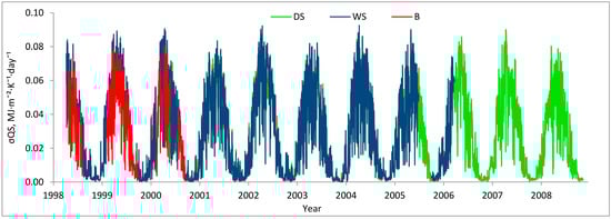 According to Equation (2), the seasonal variation of entropy production in the boreal climate followed the dynamics of the net short-wave radiation (see Figure 3). Averaged for all given years, QS,net in December at WS (25.5 MJ·m−2·month−1) was 22 times lower than in July (563.6 MJ·m−2·month−1), while (1/Tsurf − 1/Tsun) ranged only from 0.003746 (with an average temperature of −6.2 °C) to 0.003416 (with a temperature of +19.6 °C), which makes up a difference of 9.2% between the minimal and the maximal values. At DS, QS,net in December (on average for all measurement periods) was 23 times lower than in July, while (1/Tsurf − 1/Tsun) differed by 8.9%. So, in CFBR, QS,net variations were 240–260 times greater than variations of (1/Tsurf − 1/Tsun), which allows us to conclude that temperature plays a minimal role in the seasonal variation of radiative entropy production.
