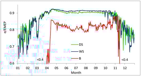 Efficiency of entropy production in radiation balance (σ/EMEP) at bog (B), wet spruce (WS), and dry spruce (DS) sites (mean for all years, B data with 10 day smoothing). σ/EMEP at B in March and mid-November was 0.5–0.8.