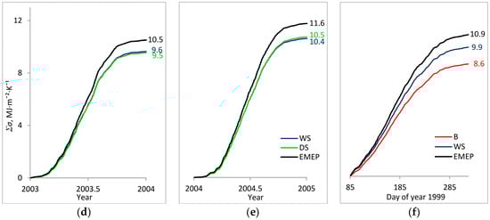 Cumulative sums of observed entropy production (Σσ) and EMEP at the wet spruce (WS), dry spruce (DS), and bog (B) sites in the Central Forest Biosphere Reserve in 2000 (a); 2001 (b); 2002 (c); 2003 (d); 2004 (e); and April–October of 1999 (f).
