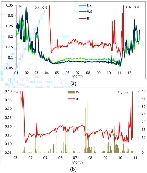 (a) Seasonal course of albedo (α) at the dry spruce (DS), wet spruce (WS), and bog (B) sites; (b) Albedo (α) and daily precipitation sums (Pr) at the bog site in 1999; α of B in March and mid-November was 0.4–0.6 and 0.6–0.8, respectively.