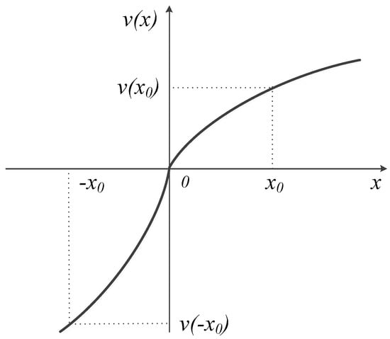 Let the normalized decision-making matrix of X be denoted as R. The positive ideal solution (PIS) can be expressed as  = (, and the negative ideal solution (NIS) can be expressed as  = (. CPT assumes that a person’s attitude toward gains and losses is different. When faced with gains, people tend to be “risk averse”. However, when faced with losses, they tend to be “risk seeking”. CPT is based on a reference point that determines the degree of preference for one alternative over another. The PIS and NIS can be viewed as the reference points [,,].