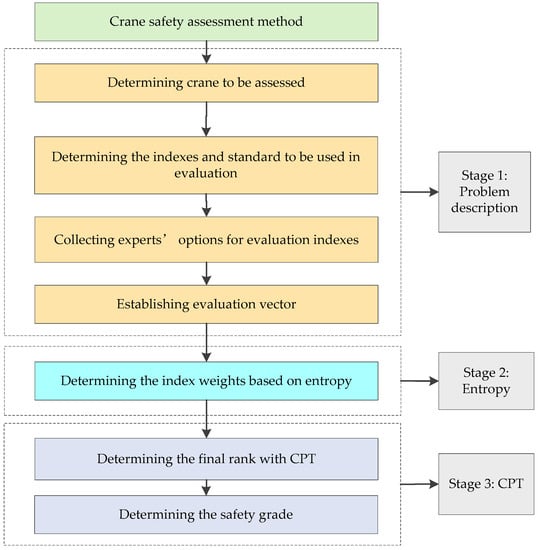 The proposed method for crane safety assessment, composed of entropy and CPT, has three stages: (1) problem description; (2) objective weights calculation with entropy; (3) determine crane safety grade with CPT. In the first stage, crane evaluation indices and standard are determined. Then experts’ options for indexes are collected. Finally, the evaluation vector is established. In the second stage, indices used in crane safety assessment are assigned weights with entropy. In the third stage, overall prospect values for cranes are ranked and the safety grade can be determined by using CPT. The procedure of the proposed approach for crane safety assessment is provided in Figure 2. The proposed method for crane safety assessment is as follows.