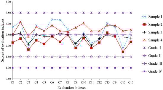 According to Table 4, the mean value vector of the 16 indexes for sample 4 is u = (2.5, 3.08, 2.43, 2.85, 2.68, 2.93, 2.68, 2.65, 2.83, 3.03, 2.68, 2.68, 2.93, 2.93, 2.68, 2.73), whereas the standard index score range for grade 1 is u ≥ 3.5. None of the 16 mean index values of sample 4 is greater than 3.5 (grade I), but the FAHP method determined sample 4 to be grade I. This is because FAHP determines the safety grade based on MMP. For instance, FAHP concludes that the crane safety is grade I based on the maximum relative membership degree of grade I crane safety being 0.322. It is clear from Table 7 that the fuzzy comprehensive evaluation value vector is M4 = (0.322, 0.291, 0.248, 0.139). Although the relative membership degree of crane safety is greatest for grade I, the sum of the relative membership degrees for grades II, III, and IV is larger than that of grade I. Hence, the assessment result given by FAHP is unreasonable. In fact, according to Table 4 or Figure 3, the average score of C3 for sample 4 is 2.43, which belongs to grade III, and the other 15 indexes have average sample scores in grade II. This strongly indicates that sample 4 should belong to grade II.
