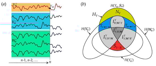 Graphical representation of the information theoretic quantities resulting from the decomposition of the information carried by the target Y of a network of interacting stationary processes S = {X,Y} = {V,W,Y}. (a) Exemplary realizations of a six-dimensional process S composed of the target process Y and the source processes V = {V1,V2} and W = {W1, W2, W3}, with representation of the variables used for information domain analysis: the present of the target, , the past of the target, , and the past of the sources, and . (b) Venn diagram showing that the information of the target process HY is the sum of the new information (NY, yellow-shaded area) and the predictive information (PY, all other shaded areas with labels); the latter is expanded according to the predictive information decomposition (PID) as the sum of the information storage (SY = SY|X + IYY;V|W + IYY;W|V + IYY;W;V) and the information transfer (TX→Y = TV→Y|W + TW→Y|V + IYV;W|Y); the information storage decomposition dissects SY as the sum of the internal information (SY|X), conditional interaction terms (IYY;V|W and IYY;W|V) and multivariate interaction (IYY;W;V). The information transfer decomposition dissects TX→Y as the sum of conditional information transfer terms (TV→Y|W and TW→Y|V) and interaction information transfer (IYV;W|Y).