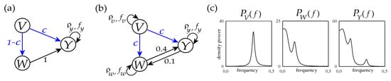 The type-I simulation is obtained setting in Equation (21), and letting the parameters c and d free to vary between 0 and 1 while keeping the relation d = 1 − c. With this setting, depicted in Figure 3a, the processes V and W have no internal dynamics, while the process Y exhibits negative autocorrelations with lag 2 and strength 0.5; moreover causal interactions are set from W to Y with fixed strength, and from V to Y and to W with strength inversely modulated by the parameter c.