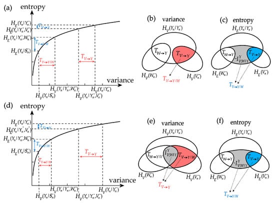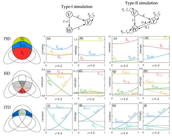 Then, we consider the case c = 1 in type-II simulation, which yields using variance and using entropy (Figure 4k,l). As seen in Figure 5d, in this case we have using variance measures (see also Figure 5e, where considering the past of W removes information), denoting redundancy between the two sources, and to using variance measures (see also Figure 5d, where considering the past of W adds information), denoting synergy between the two sources. Thus, there can be situations in which the interaction between two sources sending information to the target is seen as redundant or synergetic depending on the functional adopted to quantify information.