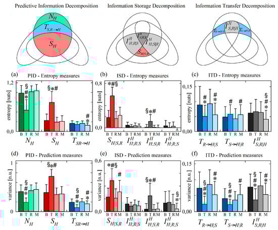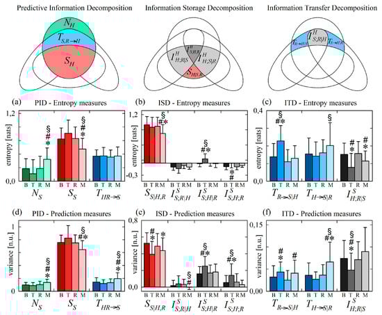 Information decomposition of the heart period (process H) measured as the target of the physiological network including also respiration (process R) and systolic pressure (process S) as source processes. Plots depict the values of the (a,d) predictive information decomposition (PID), (b,e) information storage decomposition (ISD) and (c,f) the information transfer decomposition (ITD) computed using entropy measures (a–c) and prediction measures (d–f) and expressed as mean + standard deviation over 61 subjects in the resting baseline condition (B), during head-up tilt (T), during recovery in the supine position (R), and during mental arithmetics (M). Statistically significant differences between pairs of distributions are marked with * (T vs. B, M vs. B), with # (T vs. R, M vs. R), and with § (T vs. M).