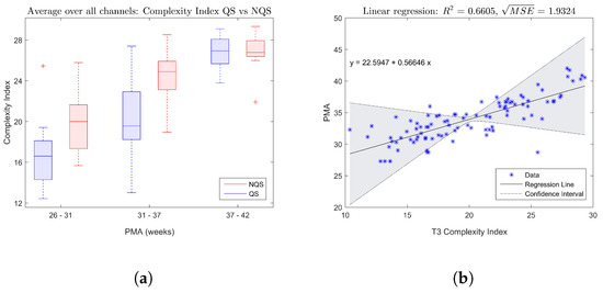 (a) Boxplots of the complexity index averaged over all channels for both quiet sleep (QS) and nonquiet sleep (NQS). A clear increase of electroencephalogram (EEG) complexity can be observed in both sleep stages. Moreover, the complexity index is higher during nonquiet sleep compared to quiet sleep. (b) The relationship between the complexity index of channel T3 and the postmenstrual age (PMA) fitted by simple linear regression.