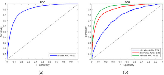 (a) The receiver operating characteristic (ROC) curve, with an area under the curve (AUC) of 90%, showing the performance of the sleep stage classifier on the complete test set. (b) The ROC curves when the least squares support vector machine (LS-SVM) classifier was applied on recordings from the different age groups. The blue curve is the ROC curve of the recordings below 31 weeks PMA and has an AUC of 76%. The red curve represents the ROC of the recordings between 31 and 37 weeks PMA. For this age group the AUC is 90%. The green curve shows the ROC for all recordings of the oldest group. The classifier performed best on this age group with an AUC of 95%.